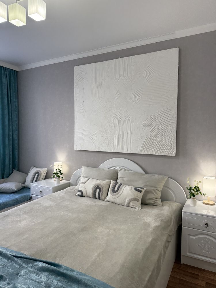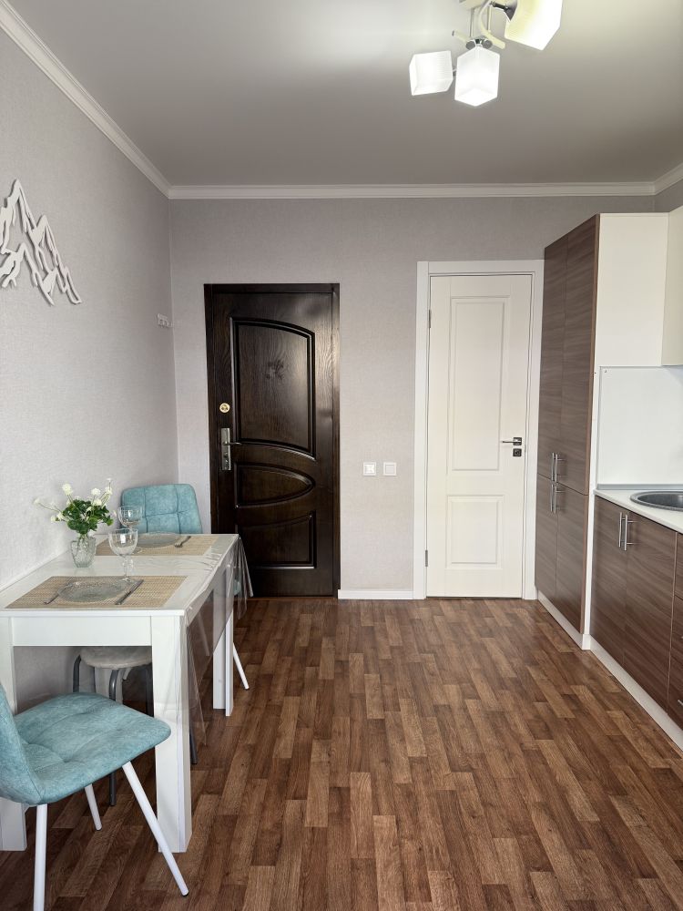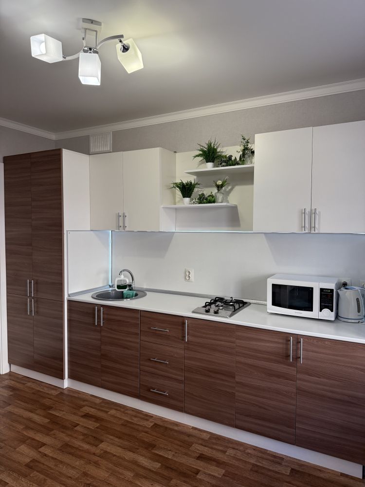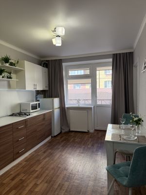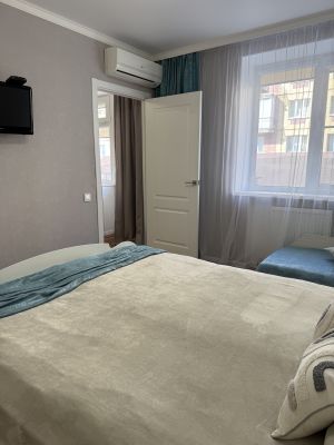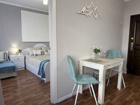 Полностью укомплектованная для проживания: двухспальная кровать, диван-кровать, шкаф, комод, обеденный стол со стульями, стиральная машина, телевизор, холодильник, газовая плита, микроволновая печь, электрический чайник, фен, утюг, гладильная доска, интернет wi fi, посуда, полотенца, постельное бельё, тапочки, средства гигиены, зимой - индивидуальное отопление, летом - кондиционер, горячая и холодная вода круглосуточно.